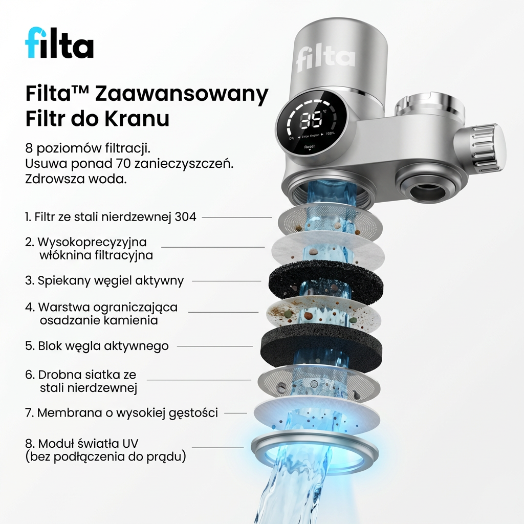 Codzienna woda z kranu może podrażniać i przesuszać skórę twarzy. FILTA™ filtruje ją w 8 etapach, usuwając metale ciężkie, chlor i bakterie, zostawiając tylko to, co najlepsze.